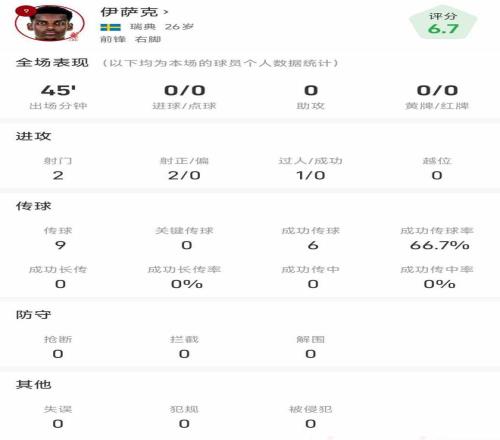 伊萨克数据:上场45分钟2次射门未能进球,仅9次传球