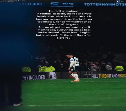 英超第13轮,热刺主场1-2不敌富勒姆,遭遇各项赛事三连败。今日,热刺后卫波罗更新社交媒体发表感言。