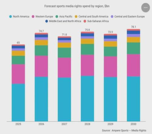 支撑这一预测的基础来自北美市场,自2025-26赛季开始,迪士尼旗下的ESPN和AT&T每年合计为NBA版权支付27亿美元,而2029年MLB也将开启新的转播周期,苹果预期将加入争夺新周期MLB的流媒体版权,涨价几乎板上钉钉。此外,普遍被认为价值低估的NFL在2026年也有望开启新周期版权谈判,达成一份更高价值的转播协议也是市场预期的结果。Ampere在报告中预测,北美将从2025年的318亿增长至2030年的380亿美元,占据全球总预计增幅的47.7%。