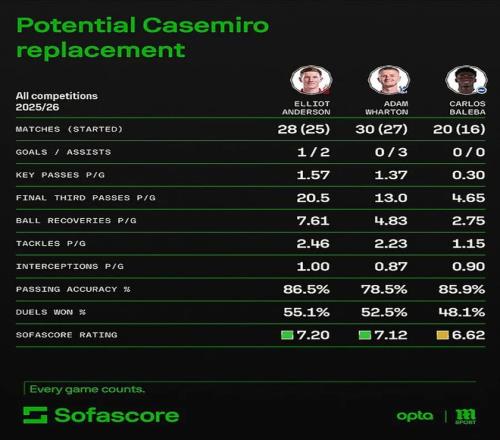 英国《太阳报》称,曼联准备引进以替代卡塞米罗的主要目标球员共有四人:包括英格兰国脚埃利奥特·安德森、亚当·沃顿和阿历克斯·斯科特,以及喀麦隆铁腰卡洛斯·巴莱巴,都是红魔拥趸听了一年的熟悉名字。