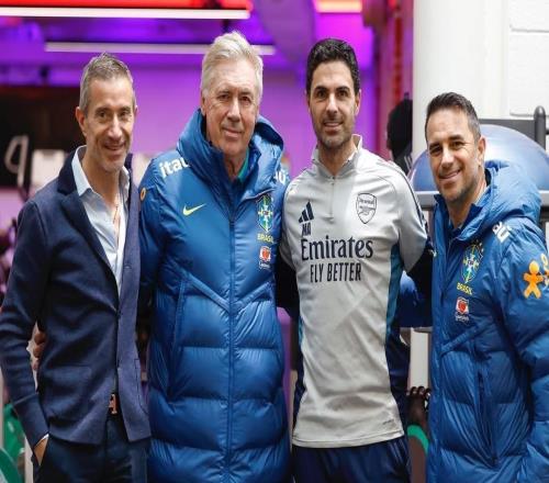 巴西队在阿森纳基地训练,安切洛蒂与阿尔特塔会面并合影 -
